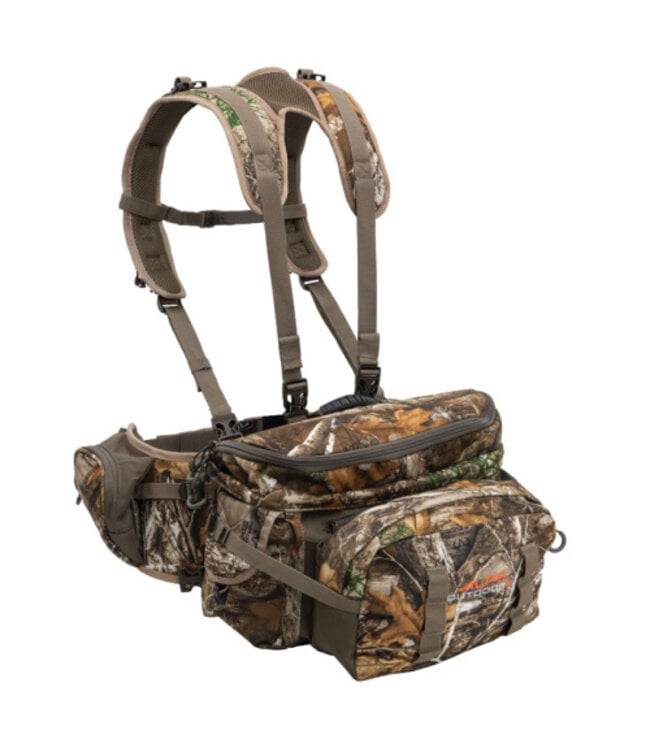Hauling decoys, gear and extra rain gear? Carrying a bow? Need a fanny pack? How about a daypack, too? Oh, and you want to haul away your meat? Nobody wants to buy 5 different packs for all your different needs, which is why ALPS OutdoorZ has brought you a pack that can accommodate all your hunting needs -- in one pack! Let us introduce you to our most versatile pack yet, the Pathfinder. The Pathfinder was designed BY hunters FOR hunters. When you're scouting or going to your stand, the fanny pack mode is great to haul along the essentials. There is a nice padded waist belt and shoulder harness system that makes carrying the Pathfinder a comfortable fit and helps distribute the weight. When more room is necessary, you simply unroll the daypack mode out from the fanny pack and you have an additional 1100 cubic inches of space. Once the daypack mode is set, you have the option to use the Pathfinder in a hauling mode or bow-carrying mode. The hauling mode has extra fabric and straps that work together to create additional space to carry extra gear. Last but not least, there's a bow pocket that fits a wide variety of compound bows, and once strapped in by the lash straps, your bow will be secure and your hands will be free! Another great feature of this pack is that it's compatible with the accessory pockets (binocular pocket and turkey call pockets) so you can attach the pockets to the front of the harness and have your most important gear in front and accessible when you need it. The accessory pockets are also compatible with the Little Bear and Big Bear.