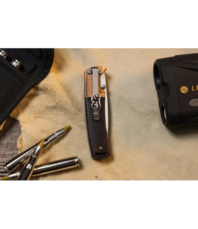 The Buckmark Hunter Folder by Browning is a versatile and stylish hunting knife designed for both functionality and presentation. Featuring a mirror-polished 8Cr14MoV stainless steel drop point blade, this knife ensures durability and precision in every cut. The hardwood handle with flush-fit brass accents not only provides a comfortable grip but also includes a brass Buckmark inlay, making it an ideal choice for engraving or gifting.
