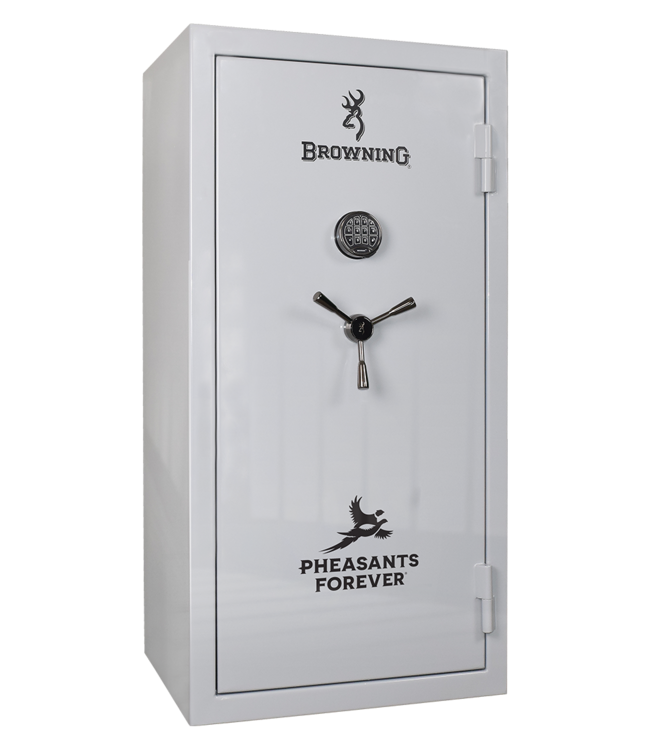 The Browning Sporter Series Upland Edition 33-Gun Pheasants Forever Safe offers unparalleled security and customization options for firearm storage. Designed to accommodate up to 33 long guns and 8 handguns, this gun safe provides a robust solution for gun collectors and enthusiasts. It features the innovative AXISâ„¢ shelving system, which allows for versatile arrangement and safe placement of firearms without the need to remove optics.
