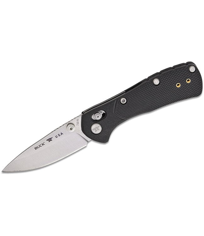he Buck 0790 Mini Range Pro is a versatile folding knife built for reliability and everyday utility. Its 2.625-inch drop point blade, crafted from premium 154CM stainless steel with a satin finish, ensures excellent edge retention and corrosion resistance. The lightweight black GFN (glass-filled nylon) handle offers durability and a comfortable grip, while the crossbar lock provides secure blade engagement during use. A deep-carry pocket clip allows for discreet tip-up carry in either right- or left-handed configurations. At just 1.90 ounces, this American-made knife is an ideal companion for various tasks, blending practicality with high-quality craftsmanship.
