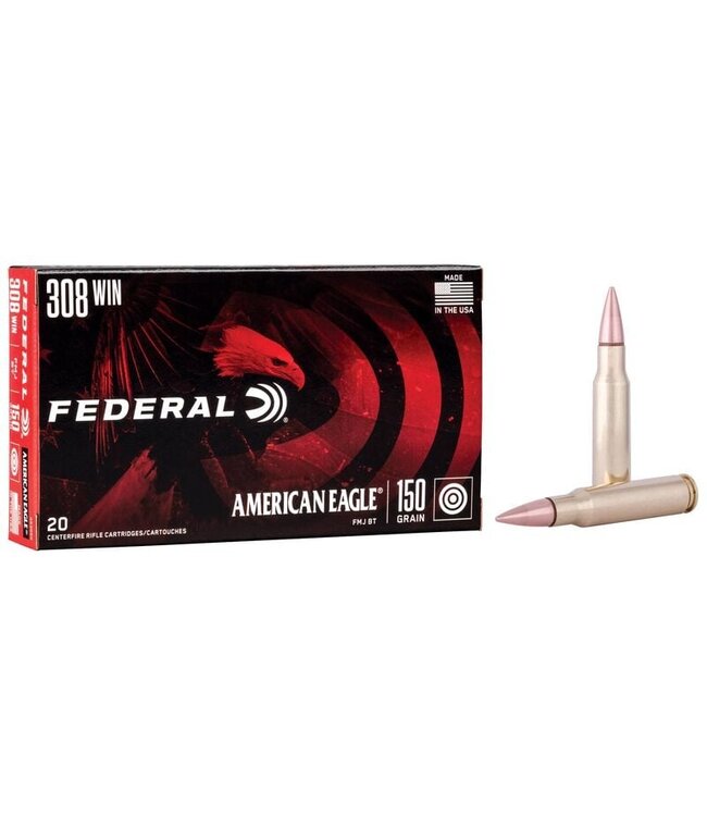 The Federal American Eagle .308 Winchester ammunition is designed for shooters who demand reliability and accuracy. Featuring a 150-grain full metal jacket boat-tail bullet, this ammo provides consistent performance with a muzzle velocity of 2820 fps, making it ideal for target practice and range shooting.