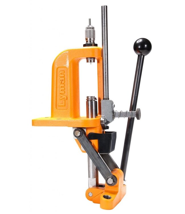 You cannot find a more sturdy, rugged, and rigid single station press available. Lyman started with a heavy duty cast iron “O” frame, and added a 1” diameter ram, and compound linkage. Work the press handle and you will feel the tight, precision fit and smooth operation. Unlike many competitive presses, the Victory Press comes with a newly designed straight line primer feed. The straight line primer feed is completely reliable and simple to use. Simply push the priming arm forward at the bottom of the ram travel to position it beneath the shell holder. For added safety, the primer feed comes with a heavy steel shield which surrounds the primer tubes. The large 5” frame opening makes even the largest magnum calibers easy to load. The Victory Press is equipped with a comfortable ball handle which can be positioned for either right or left hand use. The Victory Press is designed for use with any standard 7/8”x14 thread dies and accepts standard shell holders.