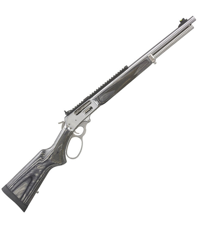 The spiral fluted bolt is nickel plated to provide smooth cycling. The big loop lever is made of 416 stainless steel and has smooth edges. Sight system includes a full length Picatinny rail , rear iron sights that are fully adjustable and the front sight is a fiber optic dot inside a tritium ring that allows for use in low light conditions. The gray laminate stock and forend feature checkering panels that are oiled and provide an excellent grip in all weather conditions. The forend has been slimmed down to provide a comfortable feel, and the butt pad absorbs recoil.