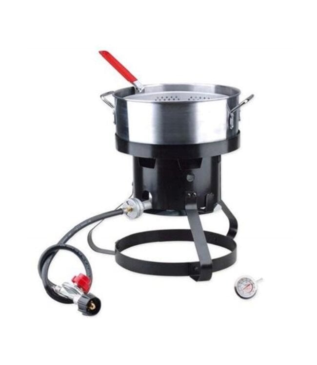 The heavy-duty 10 quart aluminum fry pot is crafted for durability and ease of use, featuring dual side handles for convenient handling. Its lightweight strainer basket, complete with a rubber coated handle, provides comfort and control while draining food. Powered by a high efficiency burner, this fryer delivers an impressive 41,000 BTUs for quick and consistent cooking results.