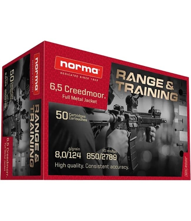 The Norma Range & Training 6.5 Creedmoor Ammo is designed for shooters who seek quality and affordability. This 124-grain Full Metal Jacket ammunition comes in a convenient box of 50 rounds, making it an excellent choice for both training sessions and recreational shooting. Norma's commitment to excellence ensures consistent performance and reliability, allowing you to focus on improving your skills.