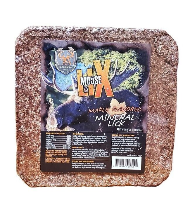 The Rack Stacker Moose LiX Maple 25lb Block is a meticulously crafted blend designed for big game enthusiasts looking to attract moose to their hunting grounds. Infused with a rich maple flavor, this mineral block is engineered to enhance the draw of wildlife, especially during rainy conditions, when its scent becomes more potent.