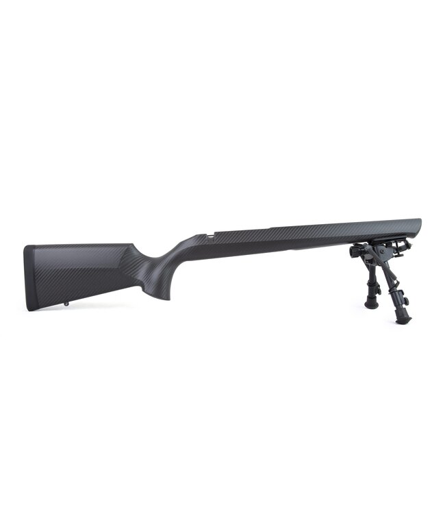 It is a stock designed as a replacement of standard wooden/synthetic factory stock or as a base for a lightweight custom Tikka-based rifle build. You can use it on hunts in all types of weather conditions, ranging from -50°C to + 60°C (-58F to 140F). The stock is made of carbon fiber epoxy prepregs by thermocompression molding, and has a rigid monocoque construction. Bronze embedded elements are integrated into the structure at the stage of its formation in places where additional components may be fastened. A filled injection molded structural plastic, designed for severe operating conditions, is used at the point of installation of the action (receiver). Please note that the stock is designed for use with optics or red dot sights. The stock has an elevated comb optimal for use with optical scopes, but making aiming with open sights a bit more complicated.
