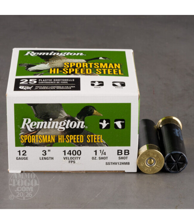 Experience the reliability and performance of Remington's Sportsman Hi-Speed Steel 12 Gauge ammunition. Each 3-inch shell is crafted for those who demand accuracy and consistency, loaded with 1 1/4 ounces of #BB steel shot. With a steady muzzle velocity of 1400 feet per second, these shells ensure your hunting trips yield success.