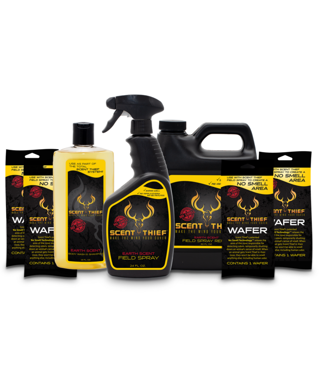 The Scent Thief Hunter's Pack is designed for the ultimate hunting experience, offering everything you need to gain that elusive advantage in the field. This pack includes a range of Scent Thief products, renowned for their ability to completely eliminate an animal's detection of threatening odors, ensuring you remain undetected during your hunt.