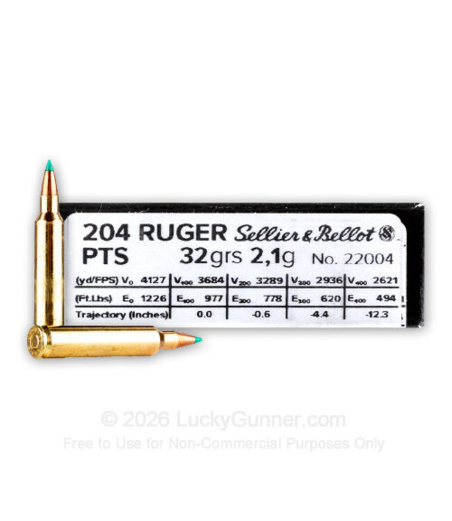The Sellier & Bellot 204 Ruger 32gr PTS ammunition is designed for precision and effectiveness. This cartridge offers a competitive edge in long-range shooting with its aerodynamic bullet shape and polymer tip that ensures reliable expansion upon impact. The strengthened casing and lead core combination minimizes the risk of shattering, providing optimal terminal performance.
