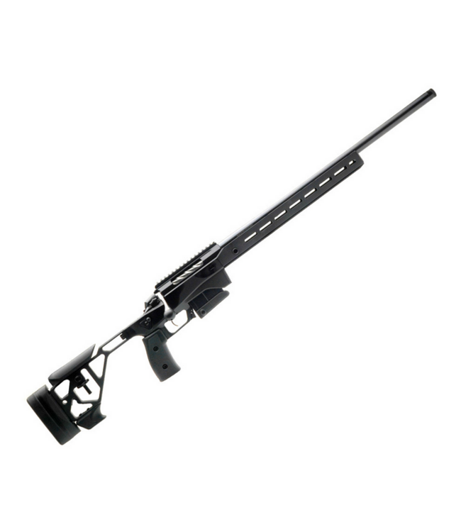 ERGONOMICS IS PRIORITIZED - The rifle's adjustable rear stock is designed for comfort and stability, offering a personalized fit. It features customizable adjustments for the length of pull, cheek rest, and recoil pad. The skeletonized stock supports additional weights for enhanced stability. An adjustable, ambidextrous thumb rest provides a solid, repeatable anchor for thumb-forward grips, ensuring precise control. The standard pistol grip can be adjusted for angle and position, optimizing trigger reach and shooting comfort. Its grip interchangeability allows for a range of customizable AR-style grip options.