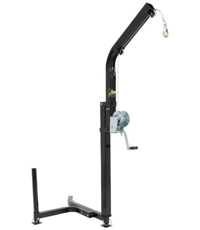 Designed with an offset outrigger for extra stability, the Rack Jack Magnum can handle up to 650 lbs of weight, making it ideal for lifting game and heavy loads. Its bearing plate allows for easy swiveling and loading into a truck bed, enhancing its versatility and ease of use.