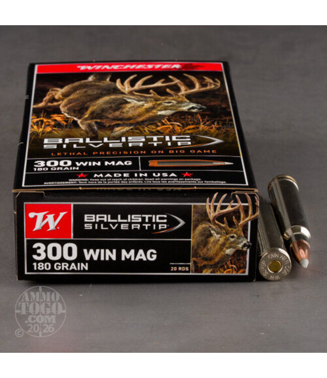The Winchester Supreme Ballistic Silvertip Ammo in .300 Winchester Magnum offers precision and power for large and heavy game hunting. Featuring a 180-grain bullet, this ammunition provides delayed, controlled expansion and deep penetration, making it ideal for tough skin, heavy muscle tissue, and bone.